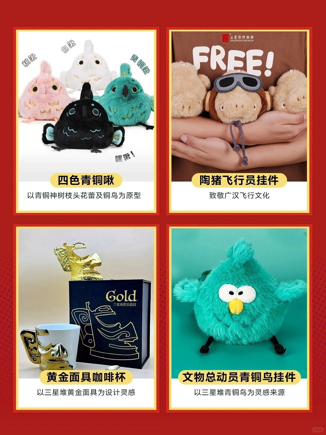 ·四色青铜啾毛绒:以青铜神树枝头花蕾及铜鸟为原型,圆滚滚身体 + 呆萌眼神,超好 rua,摆在桌面能稳稳 “坐住”。